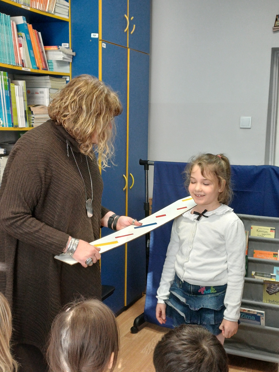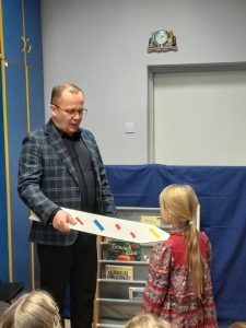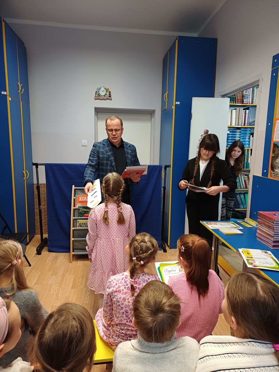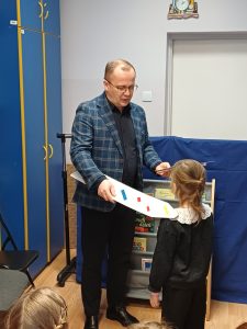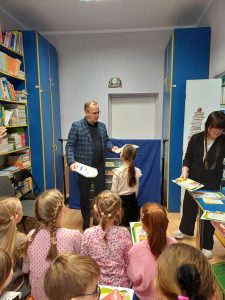 Zanim uczniowie zostali pasowani, obejrzeli teatrzyk pacynkowy, w którym, znane dzieciom postacie bajkowe, przedstawiły zasady korzystania z biblioteki, poszanowania książek oraz wymieniły korzyści płynące z czytania. Uroczystego pasowania dokonał pan dyrektor Grzegorz Nicpoń oraz pani wicedyrektor Dorota Martinek. Następnie dzieci wypożyczyły do domu wybrane przez siebie książki. Było to niezwykłe spotkanie ze światem książek w bibliotece szkolnej.