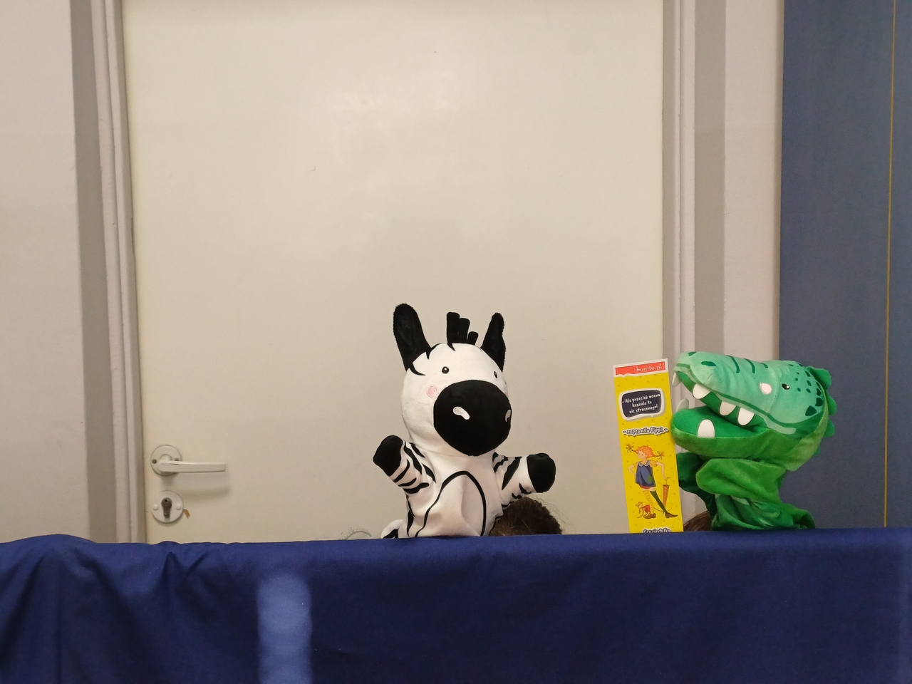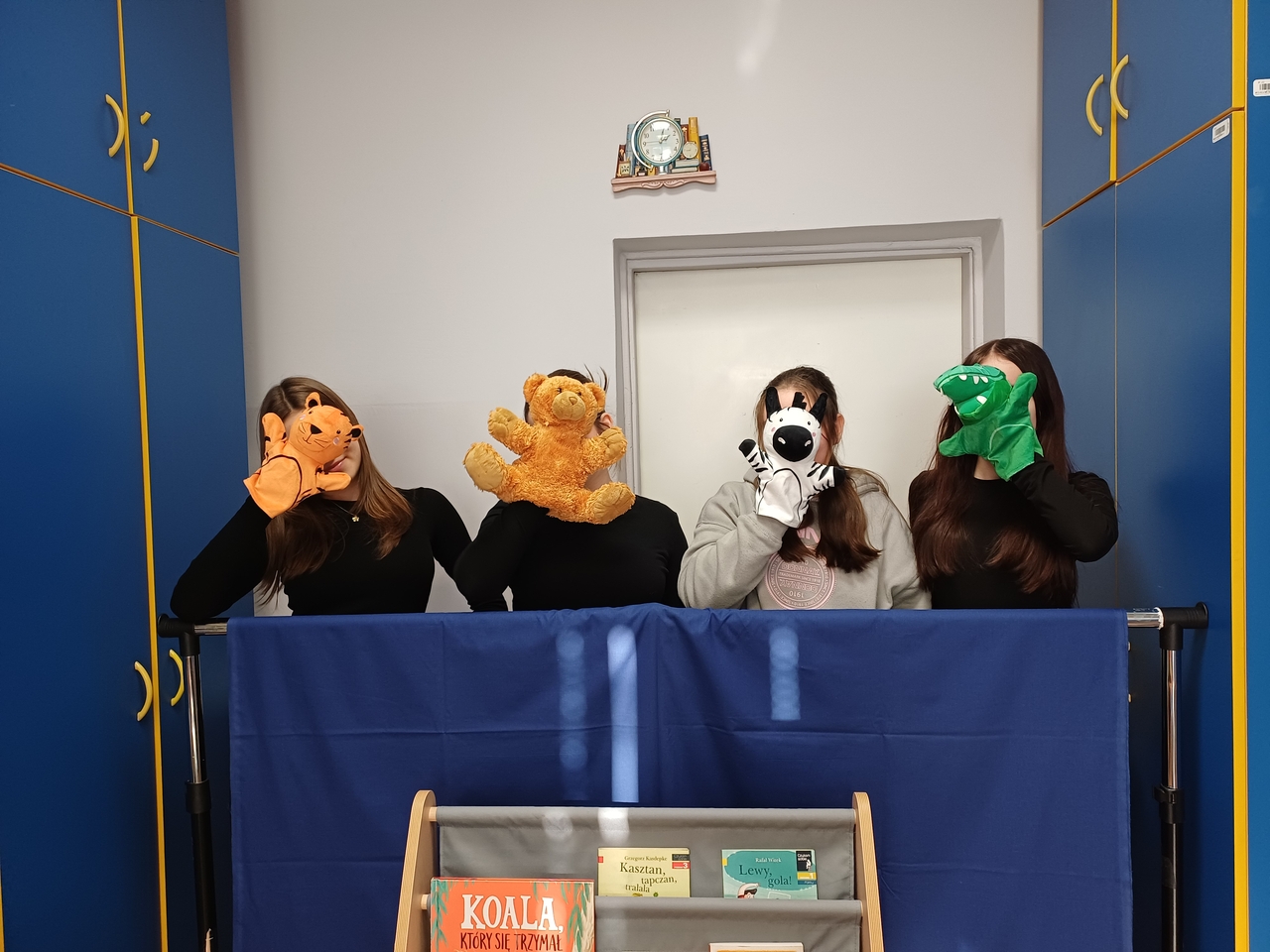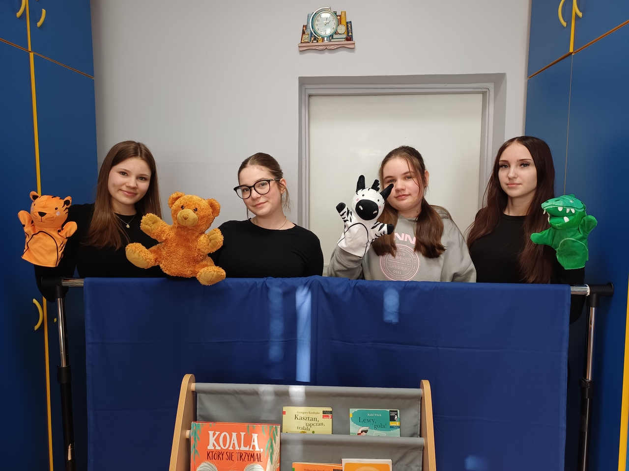 W przedstawieniu pacynkowym wzięły udział uczennice klasy 8a: Helena, Patrycja, Zuzanna oraz Nadia, a przy pasowaniu pomagała Lena – uczennica klasy 6a.
