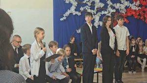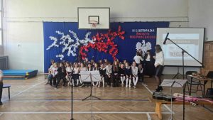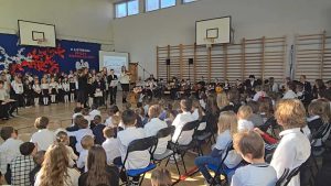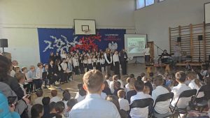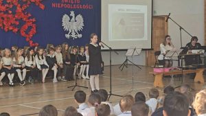 Uczniowie i nauczyciele naszej szkoły wzięli dziś udział w akademii z okazji kolejnej rocznicy Odzyskania Niepodległości przez Polskę. Szkolny chór, zespół instrumentalistów oraz grupa lektorów z nauczycielami zaprezentowali wiadomości historyczne oraz piękny muzyczny i patriotyczny repertuar. Na zakończenie szkolnej akademii wszyscy z dumą i powagą odśpiewaliśmy Hymn Polski.