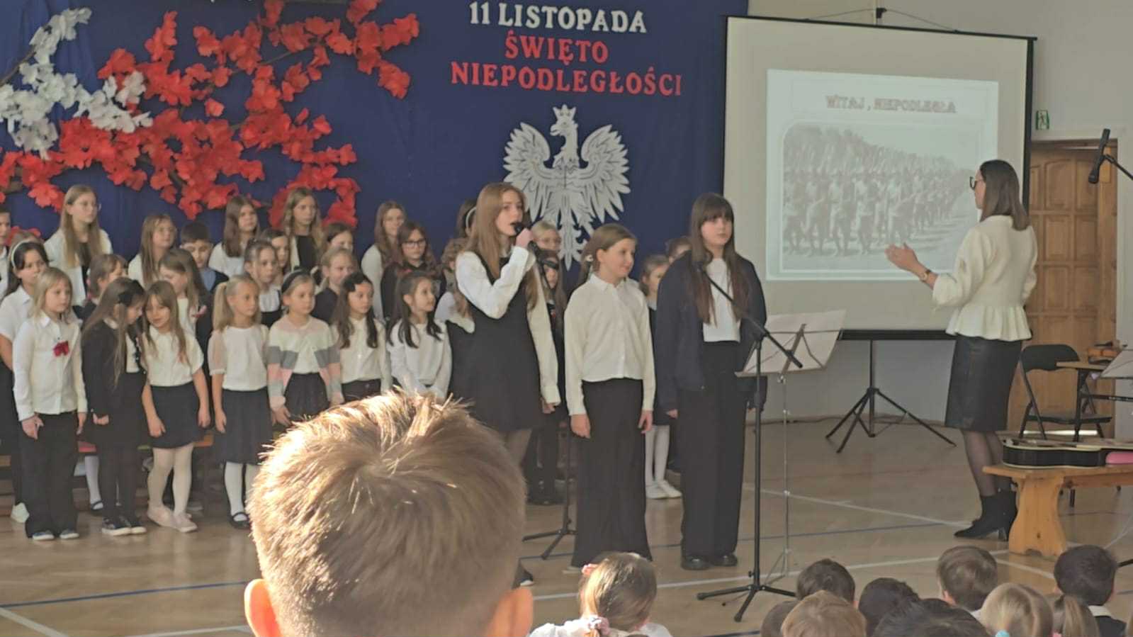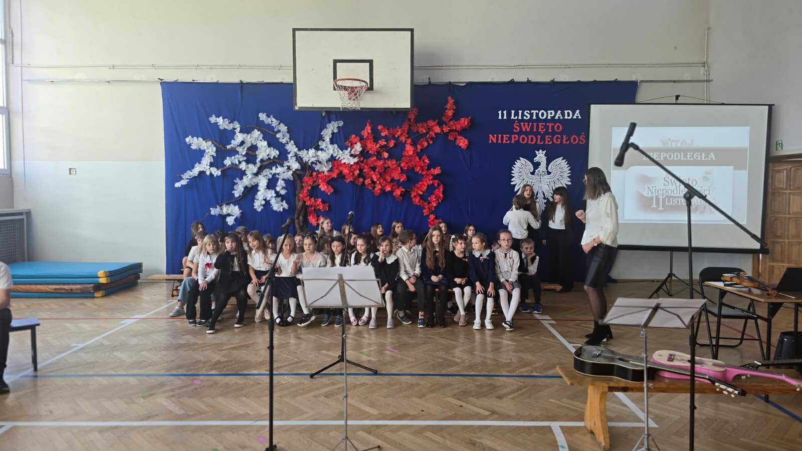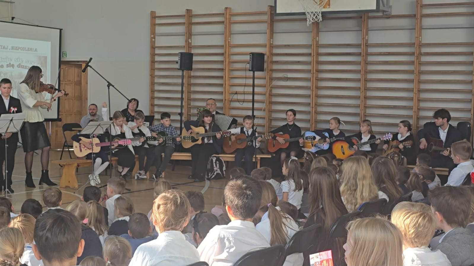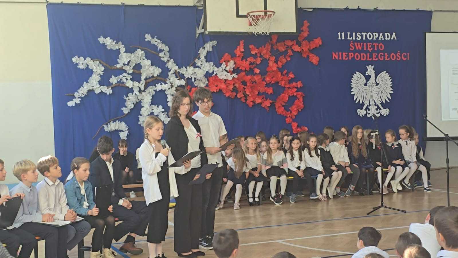 Uczniowie i nauczyciele naszej szkoły wzięli dziś udział w akademii z okazji kolejnej rocznicy Odzyskania Niepodległości przez Polskę. Szkolny chór, zespół instrumentalistów oraz grupa lektorów z nauczycielami zaprezentowali wiadomości historyczne oraz piękny muzyczny i patriotyczny repertuar. Na zakończenie szkolnej akademii wszyscy z dumą i powagą odśpiewaliśmy Hymn Polski.